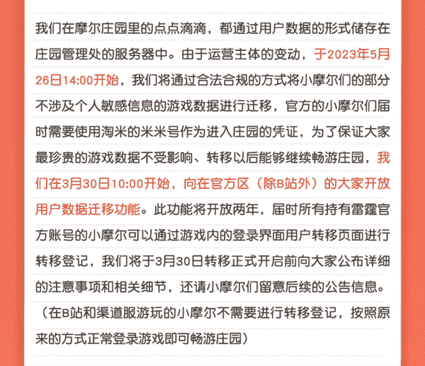 合作结束本就是开发方和代理方双方的事情,,,降低这件事情对玩家的影响,,才是对所有珍视这段童年的摩尔玩家最好的呵护。。目前看来,,,,用户完全不用担心后续因无法登录游戏而造成任何数据上的损失,,只要及时进行账号转移,,,就可以好好保留、、延续在庄园的痕迹和回忆,,,,继续在庄园里做快乐的红鼻子小鼹鼠。。。。