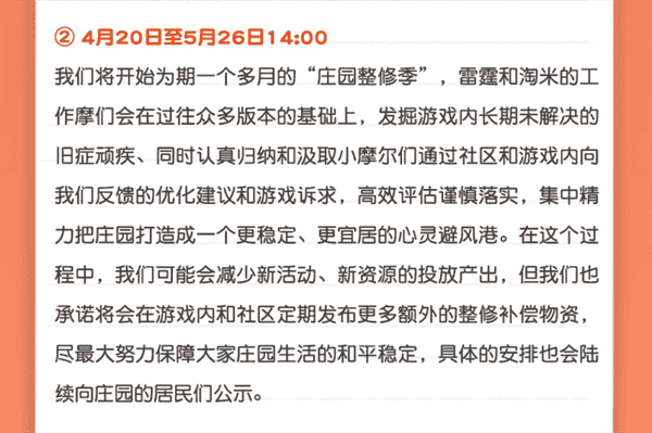 合作的结束并不意味着这个童年IP的结束,,,对于《摩尔庄园》手游而言,,,这是一个新阶段的开始。。。。后续游戏内将开启庄园重构计划,,会就以往遗留下来的BUG进行集中修复,,,,并在游戏内和社区定期发布更多补偿物资。。。。
