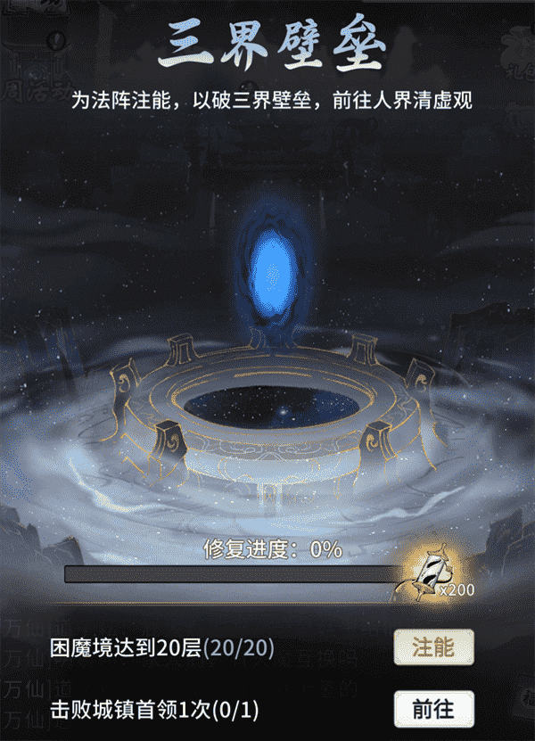 当你修为达到返虚/破虚中期后,,可在城镇寻得芸丫并激活神秘法阵,,,,通过收集材料、、、、击败首领等方式为法阵注能,,,借以打破三界壁垒,,,开启支线剧情“清虚旧梦”