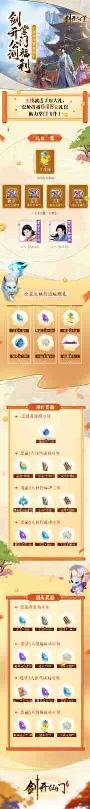 游戏为大家准备了海量的福利,,,,包括上线即可获得的全渠道预约礼包、、十连抽等福利,,输入密令“JK666”、、、“JK888”即可领取紫色弟子,,达到金丹期后还有功法宝箱可领,,,助力全宗上下实力提升……所有奖励总价值超过648元,,而邀请好友一起体验,,更可以获得额外的奖励哦~