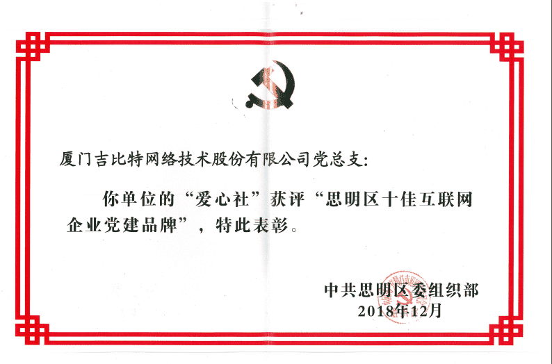 经初审评选、、、、网络评选和专家评审等环节,,,,"厦门一竞技网络技术股份有限公司党总支-爱心社" 从全区28个参评党建品牌中脱颖而出,,获评"思明区十佳互联网企业党建品牌"。。